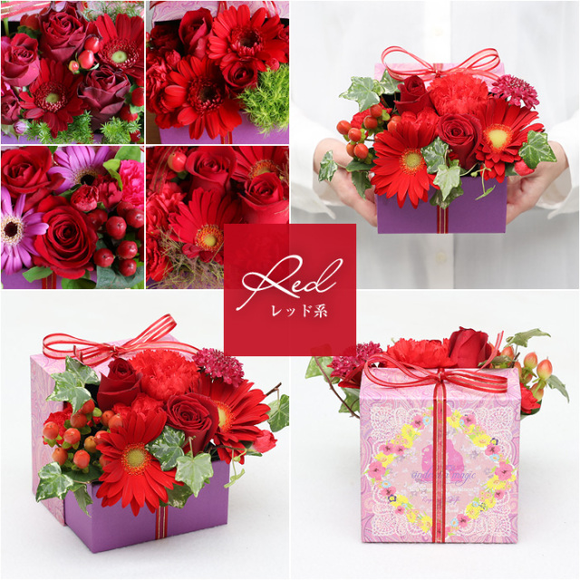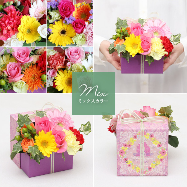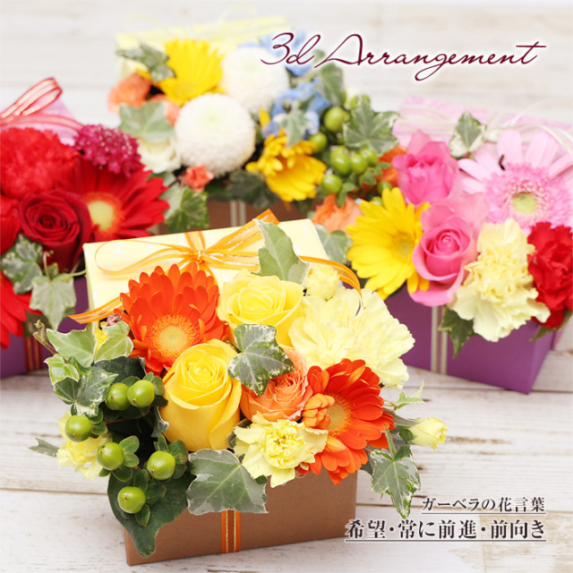 飛び出すフラワーボックス3Dアレンジメント 当店オリジナルの紙製ボックスを使って蓋はあえて閉じずに、後ろ側にL型にはめこむことで、お花が飛び出しているようなデザインにしました。ボックスに敷き詰めず、立体的にアレンジすることでリボンをかけたまま飾ることができます。 ガーベラ全体の花言葉は「希望・常に前進・前向き」など。 ポジティブなものが多く、お誕生日や結婚記念日などの贈り物としてももちろん、お見舞いなど相手を応援したいときに贈るフラワーギフトとしても人気があります。 4色からご選択ください。使用する花材は、季節・仕入状況により変わりますが、その日その季節の一番よい花で、お客様だけのオリジナル商品をお届けします。四季折々のお花をお楽しみください。 紙製ボックスはオシャレなバイカラー。お花が終わった後も、インテリアの一部として飾っていただけます。 【出産祝い】【結婚記念日】【誕生日】【お見舞い】【クリスマス】【バレンタイン】【ホワイトデー】【退職】【母の日】