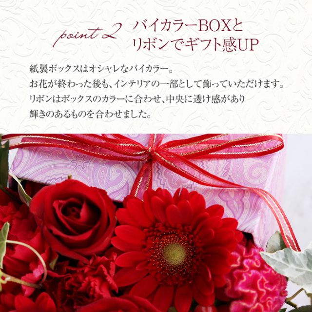 当店オリジナルの紙製ボックスを使って蓋はあえて閉じずに、後ろ側にL型にはめこむことで、お花が飛び出しているようなデザインにしました。