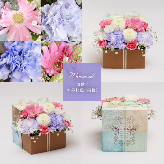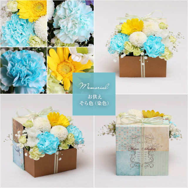 - 「お供え染色すみれ色」は、紫色に染めたカーネーションを入れて。「お供え染色そら色」は、水色に染めたカーネーションを入れてお作りします。花用の染色液で吸い上げによる色付けを弊社にて行っております。個体差による色むら・濃淡が起こる場合がございます。予めご了承ください。