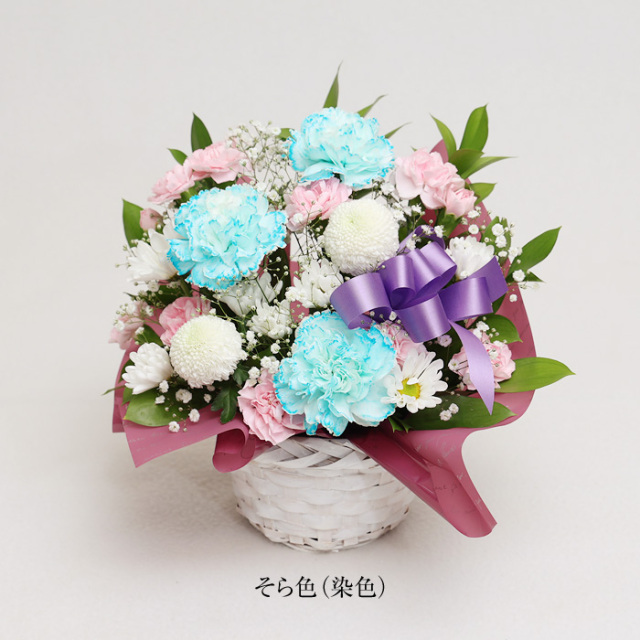 期間限定染色カーネーションのお供えアレンジメント。 花瓶の心配がなく届いてすぐにご仏前にお供えしていただくことができます。 ご葬儀が終わってからご不幸を知った場合、また法要が遠方で行われるので出席できない方など、ちょっとお花を贈りたい方におすすめサイズです。 すみれ色は、紫色に染めたカーネーションを入れて。そら色は、水色に染めたカーネーションを入れてお作りします。