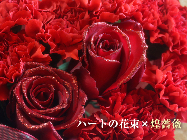 煌薔薇(きらめきばら)加工とは、寄り添う2人を表す「2本のバラ」の花弁のふちにラメを塗るオプションです。(+200円)光の加減で花びらが高級感のある輝きを放ち、普通のバラよりも存在感が増します。バラが最も美しく見えるバランスで、1枚ずつラメの量や塗る範囲を調整しています。「特別な日だからこそ、最高のものを贈りたい!」というお客様のお声から生まれた煌薔薇加工。特別な日、バラの花も最高のドレスアップをして祝福します。是非ご利用ください。