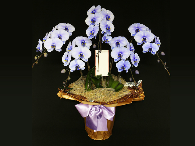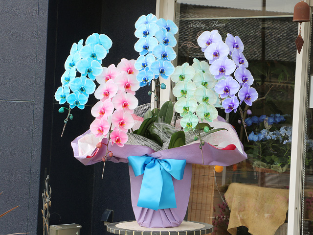 エレガンスシリーズに使われている色とりどりの胡蝶蘭は、愛知県豊橋市の松浦園芸が染色し販売しています。松浦園芸は、胡蝶蘭を育てて四半世紀・年間24万鉢を越える日本トップクラスの生産をしています。世界4ヶ国で特許取得した珍しい胡蝶蘭エレガンス・シリーズの日本で唯一の生産者です。日持ちの良い高品質な胡蝶蘭にこだわり専用コンピュータで24時間0.5度単位の温度管理と湿度・日照量を管理し高寿命を実現。一鉢一鉢、職人の手で水やりをし心を込めて育てた胡蝶蘭です。質と量に拘った最高級の胡蝶蘭を、是非ご堪能下さい。